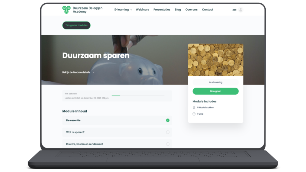 Voor mij was de cursus een godsgeschenk. Goede, logische opbouw die elk aspect van beleggen en duurzaamheid op een toegankelijke manier aanbrengt.