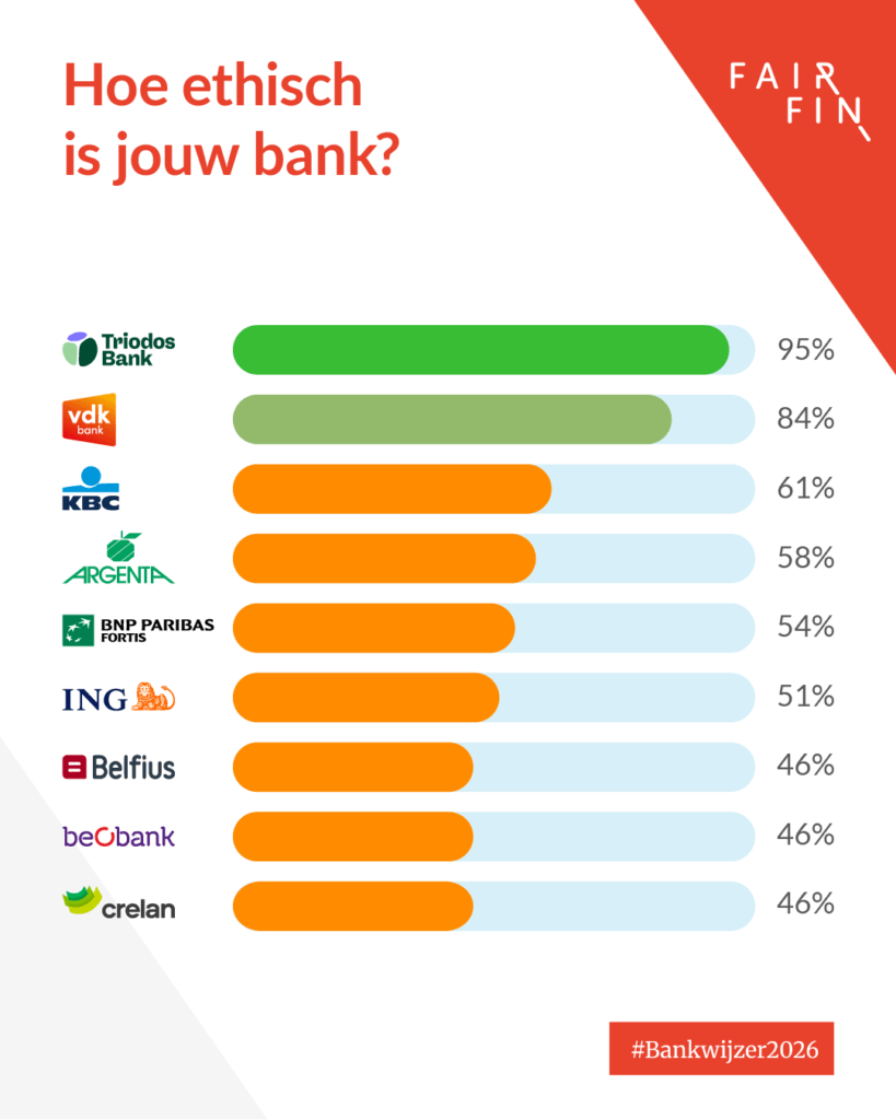 De Bankwijzer is een initiatief van FairFin, een Belgische vzw die banken bij de les houdt. Tweejaarlijks geven ze de bekendste Belgische banken een duurzaamheidsscore. En zoals vaak gaan het overgrote deel van die banken ruim onder de lat door.